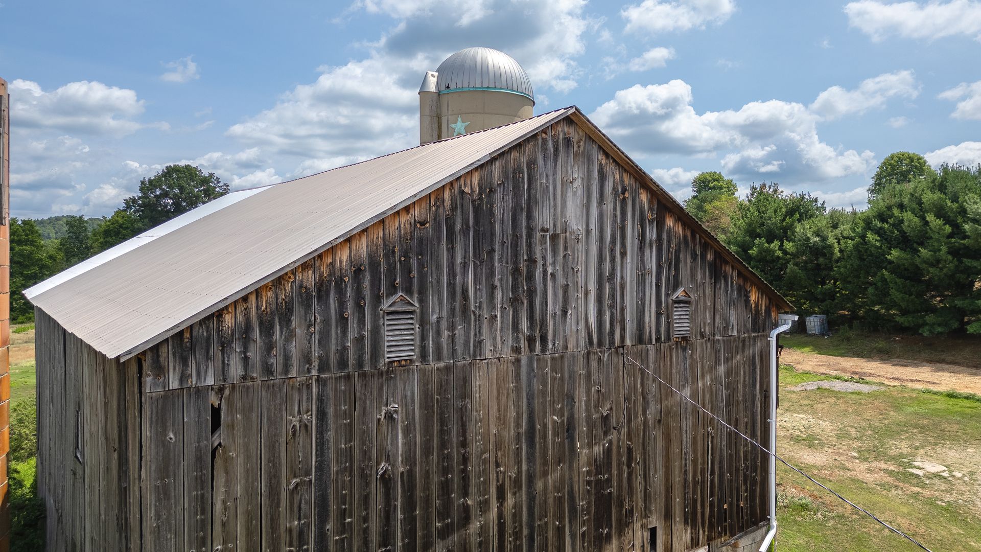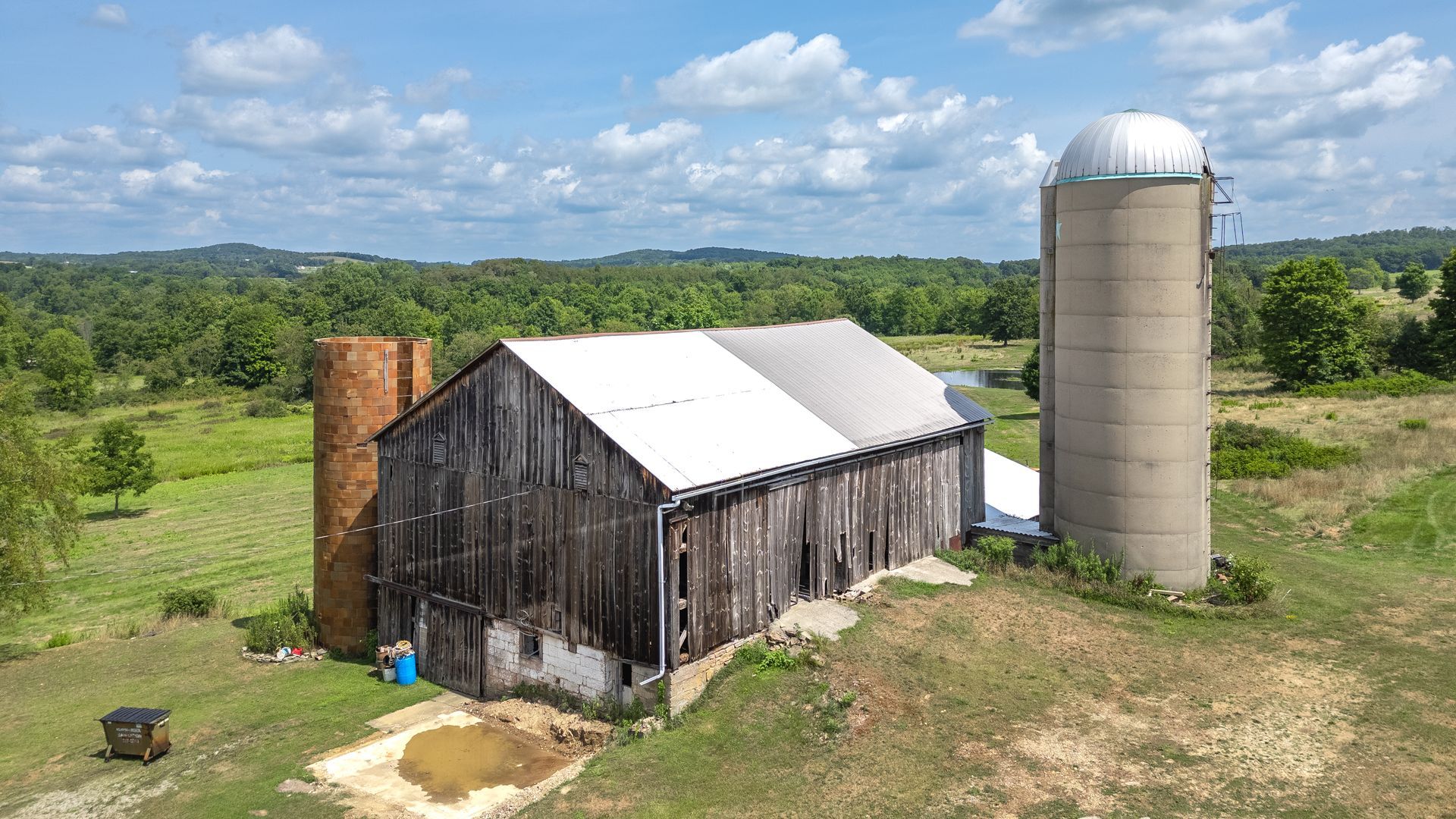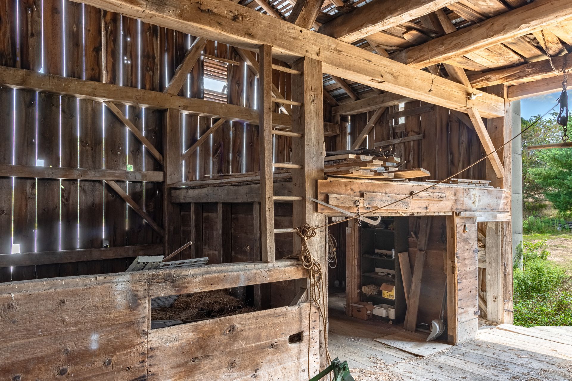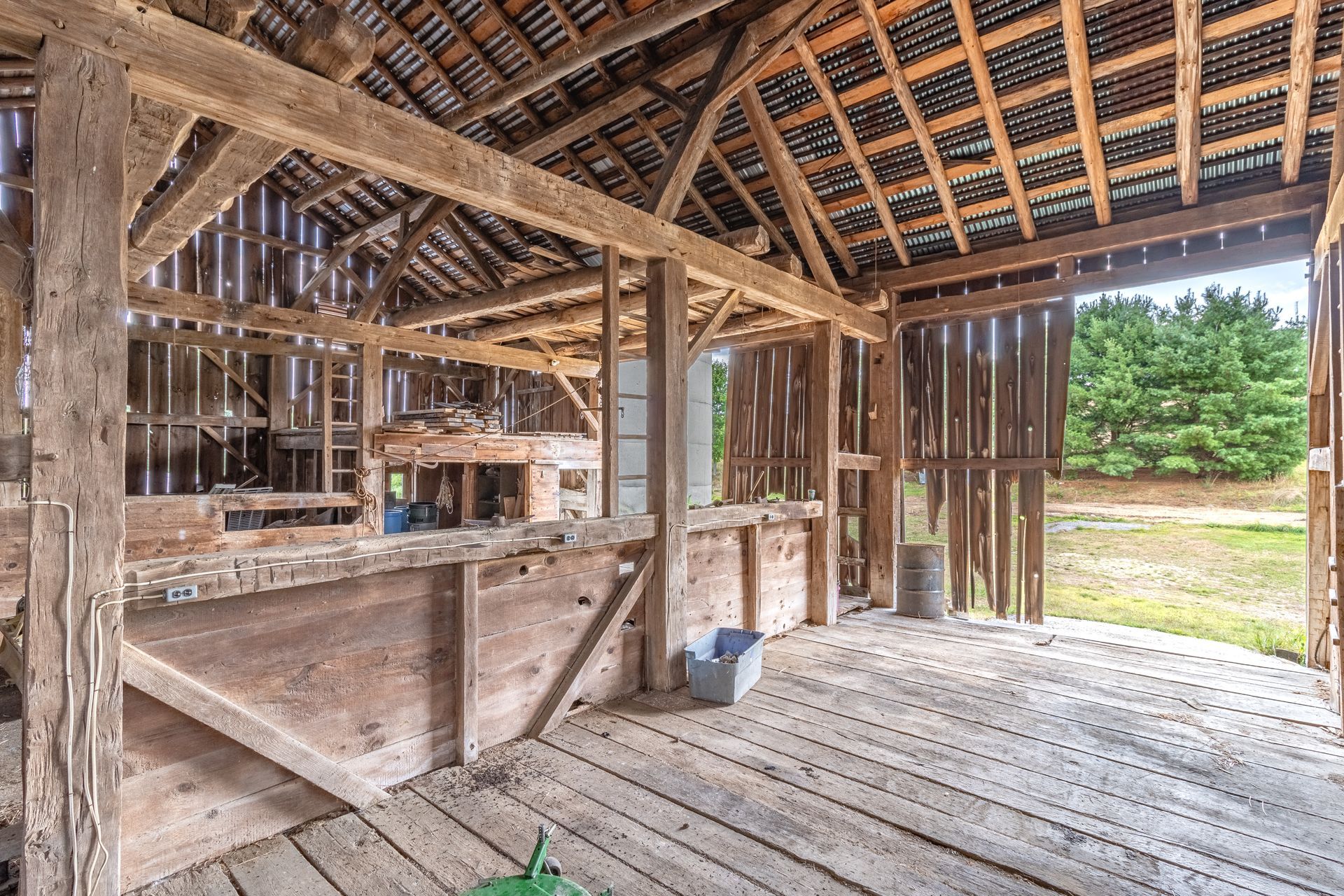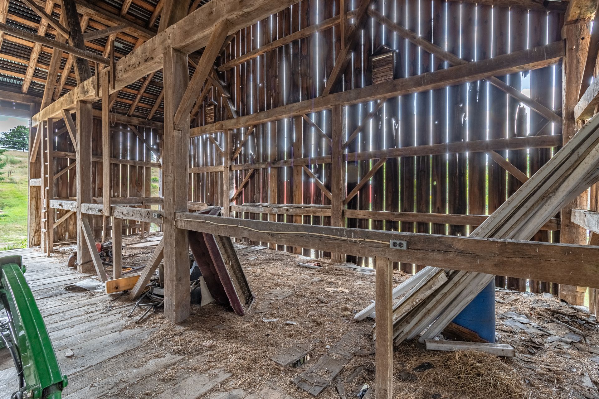 The barn's frame is made of hand-hewn timber meticulously joined to form a structure of undeniable strength and character. Its 5/4/variable bent/bay spacing reveals a design optimized for functionality and durability. While currently a single-story building, the barn's soaring roofline hints at the potential for a transformative loft conversion.
