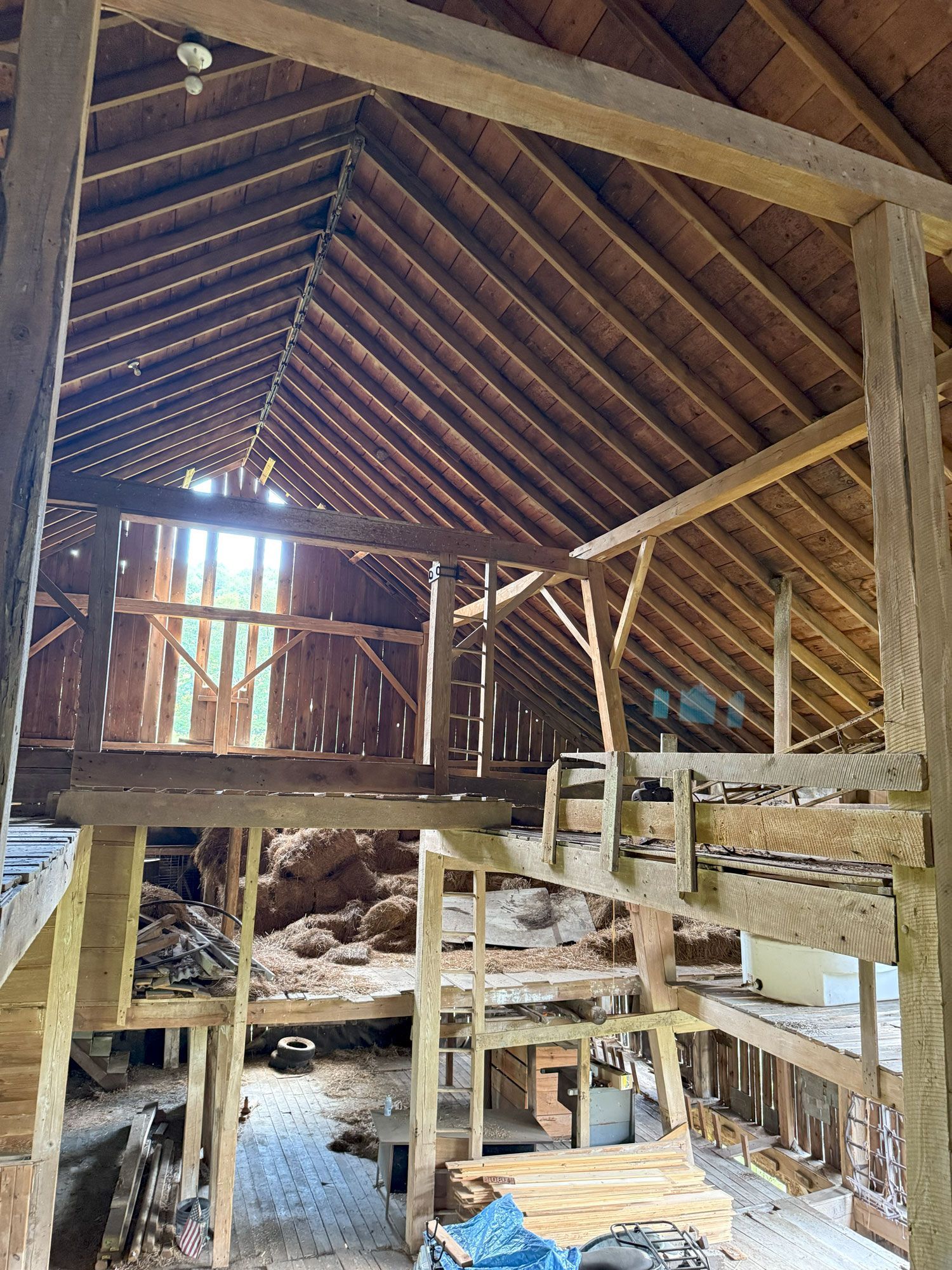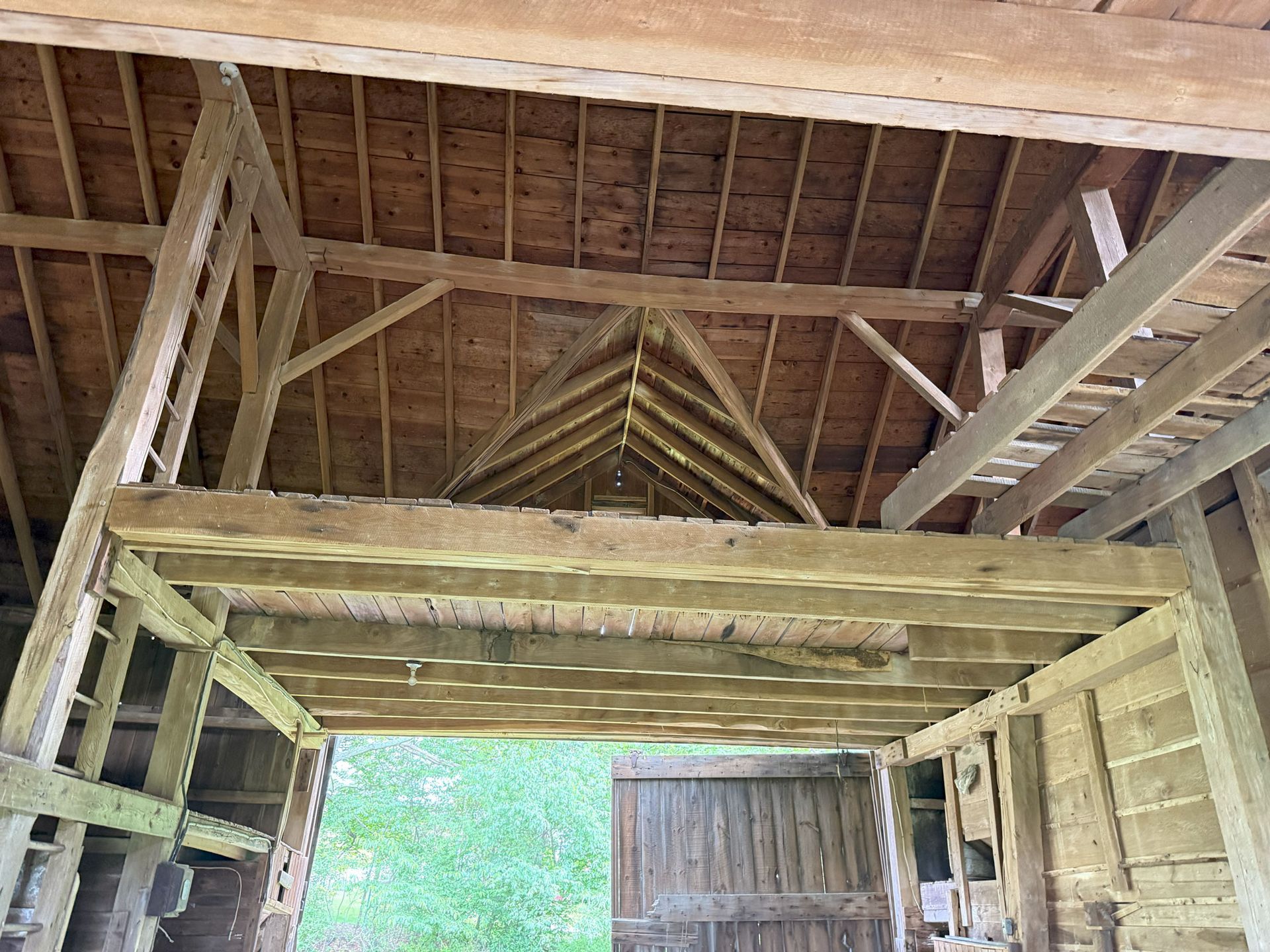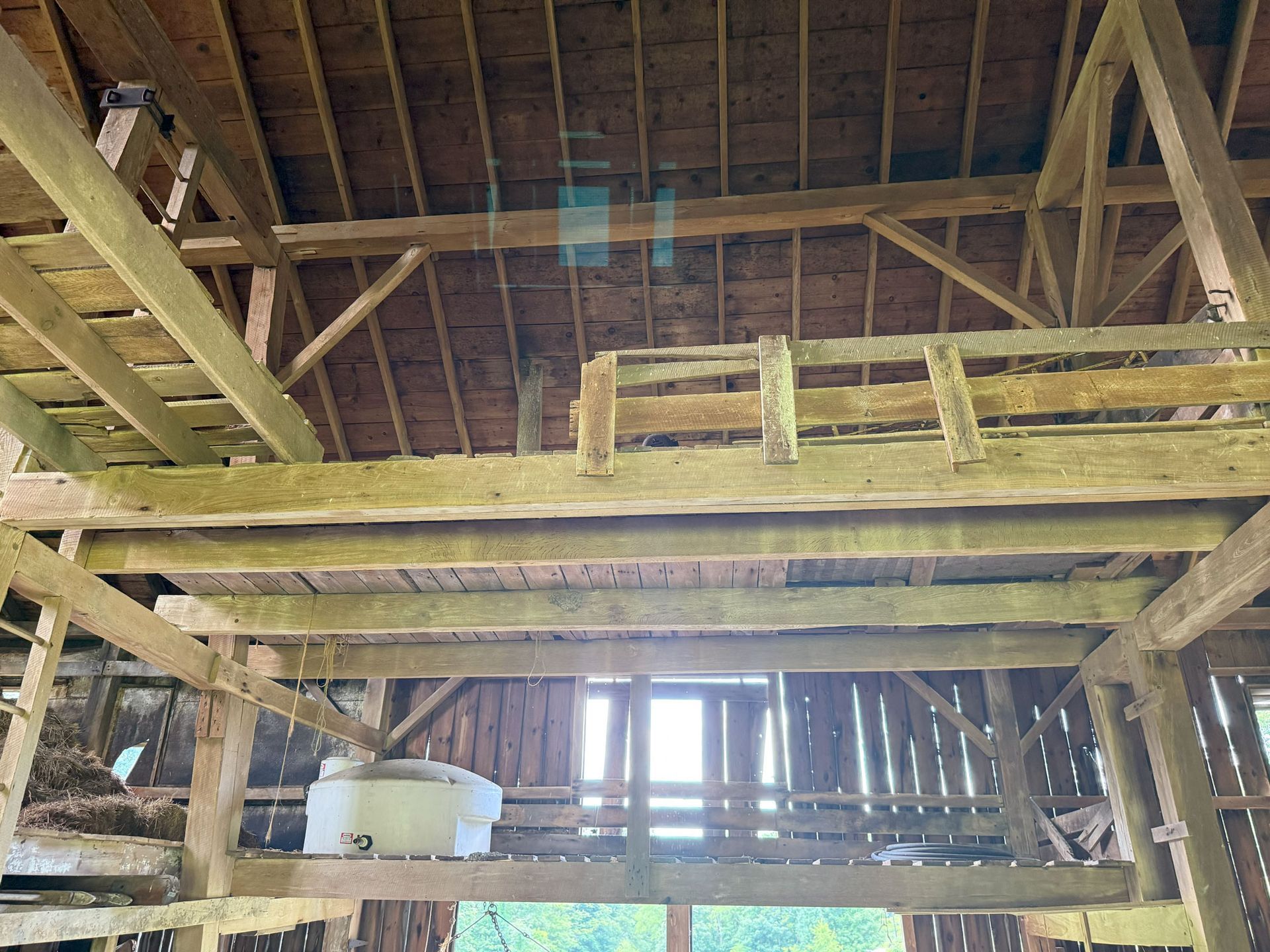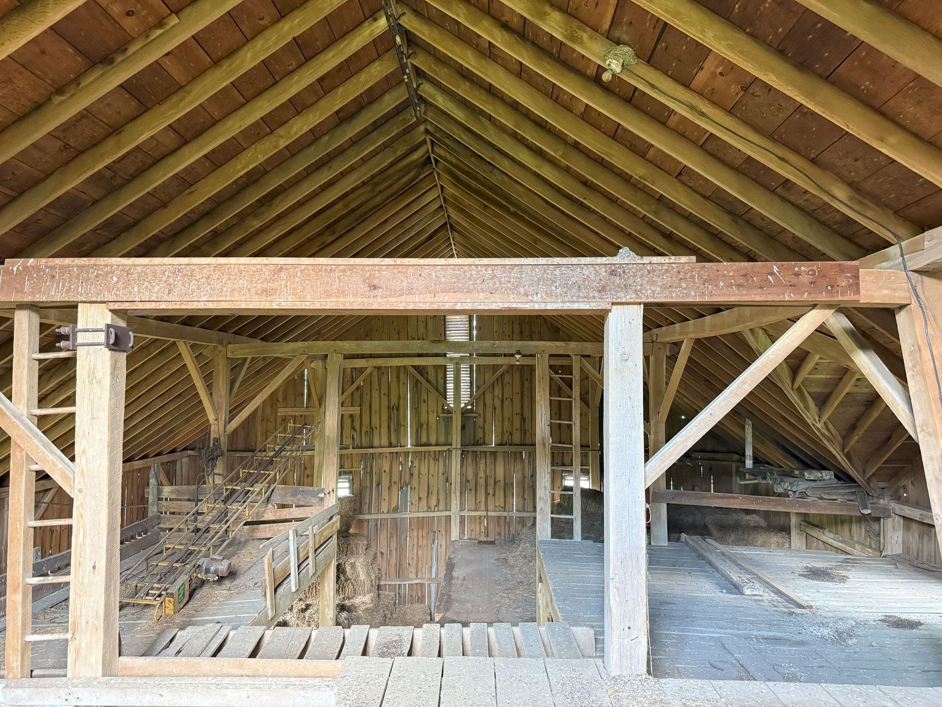 Truly unique in how robust this frame is. The main timbers in the frame measure 11"x 11" and 12"x 12". Once restored, the warm pine timbers will warm a home to its finest. The central space is only interrupted by two big timber ladders and the rest is open for the design of your project. This barn also has an addition that, as an optional space that can be added anywhere around the perimeter of the barn, can serve so many creative purposes. All the more reason to give this barn frame a good look.