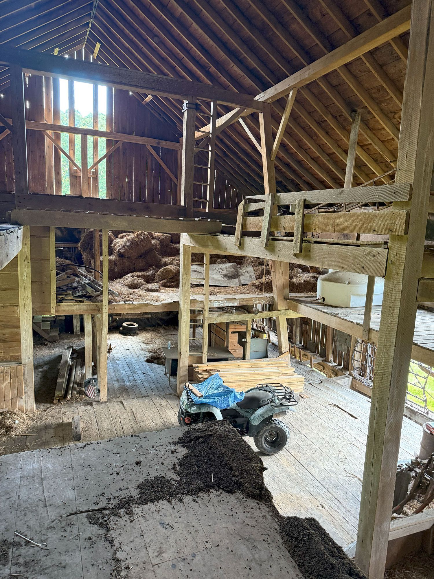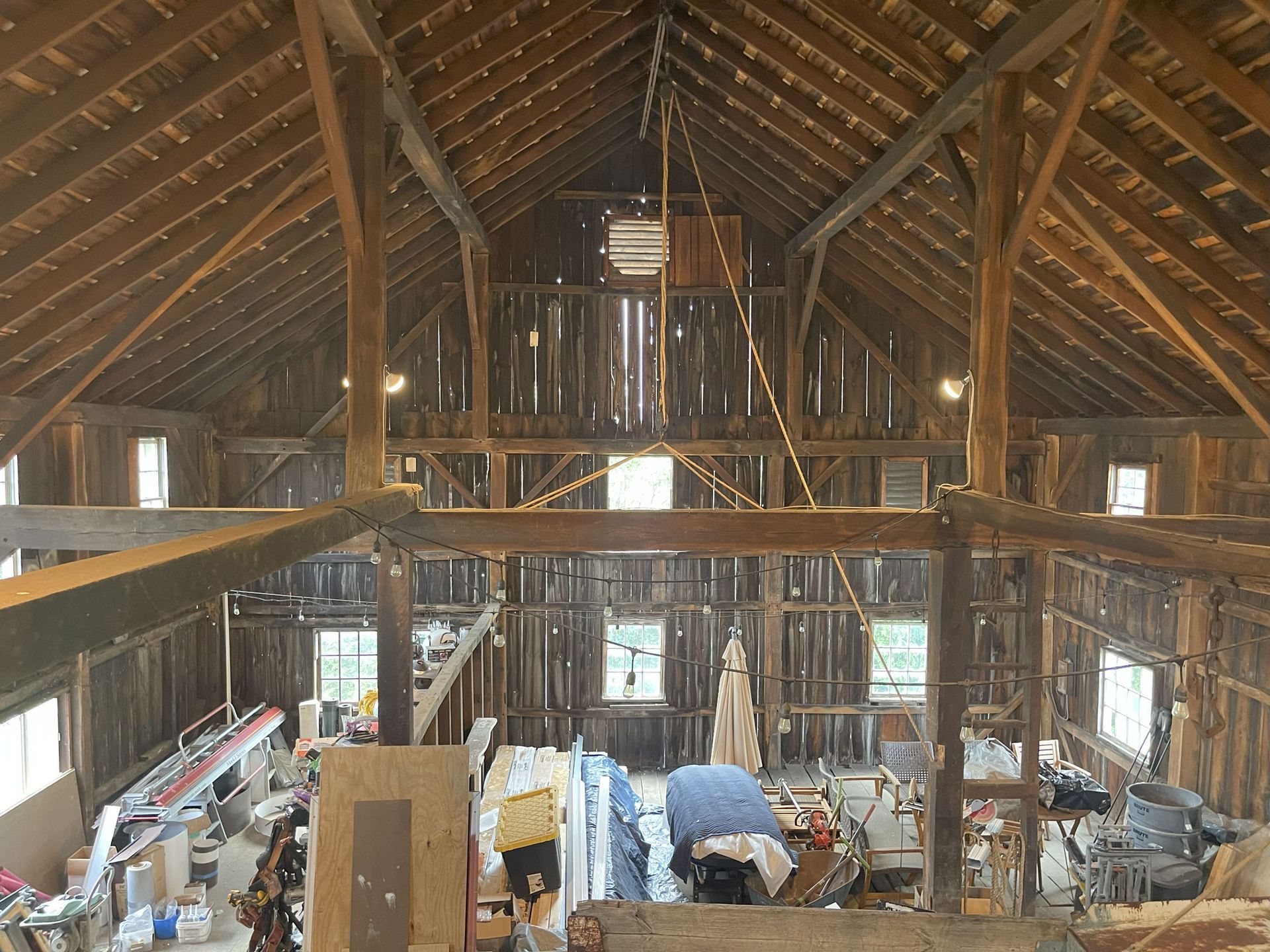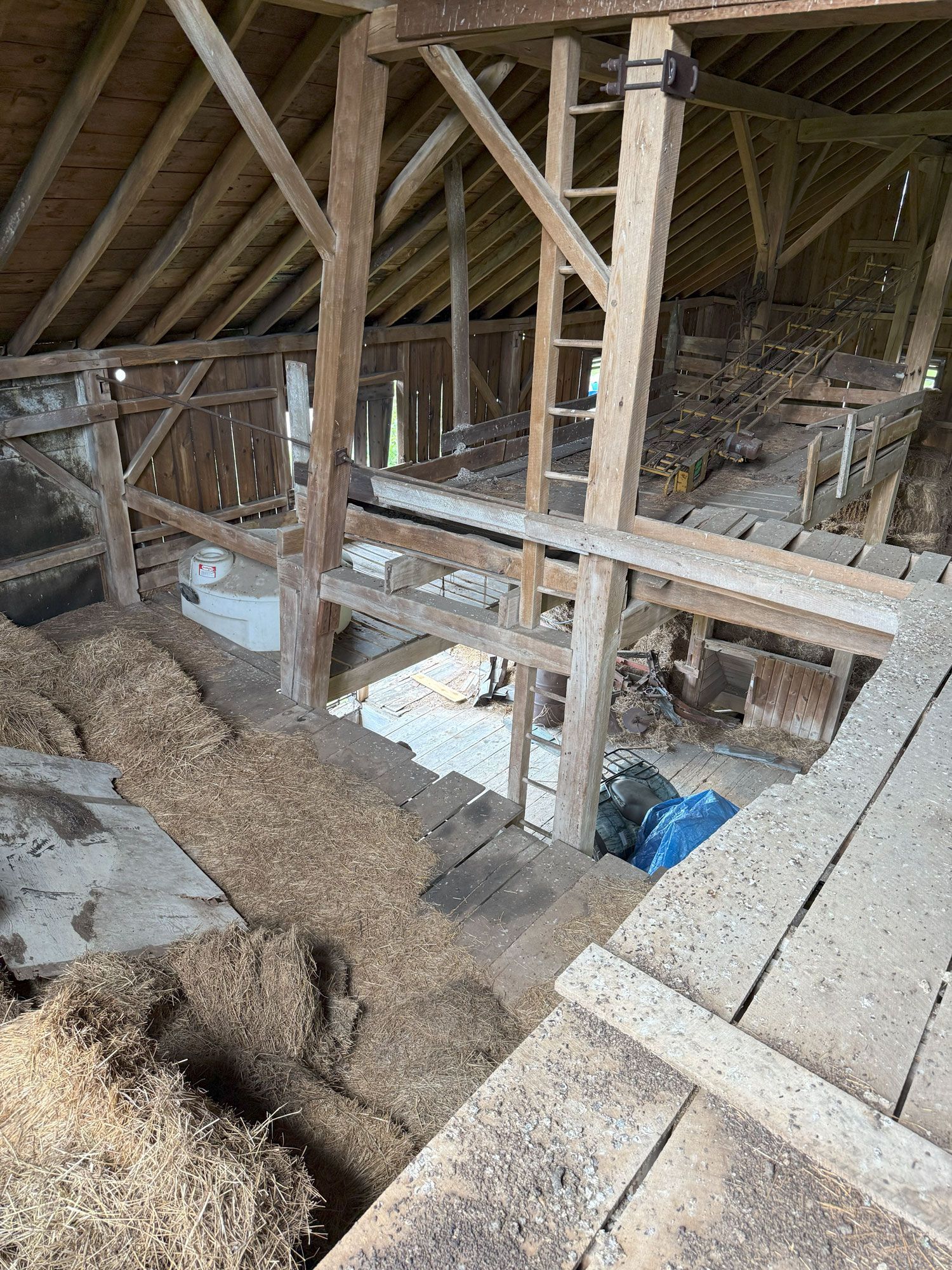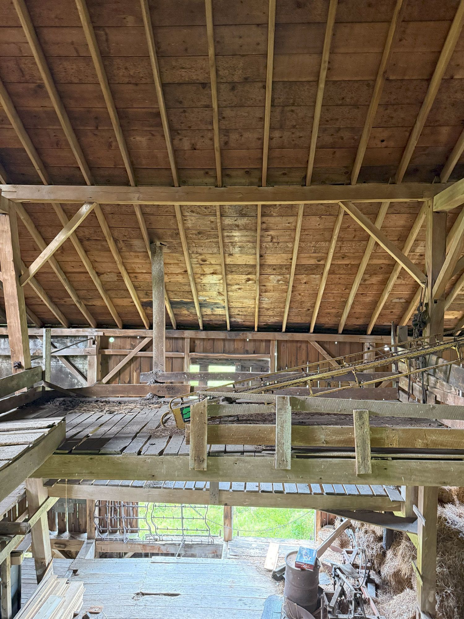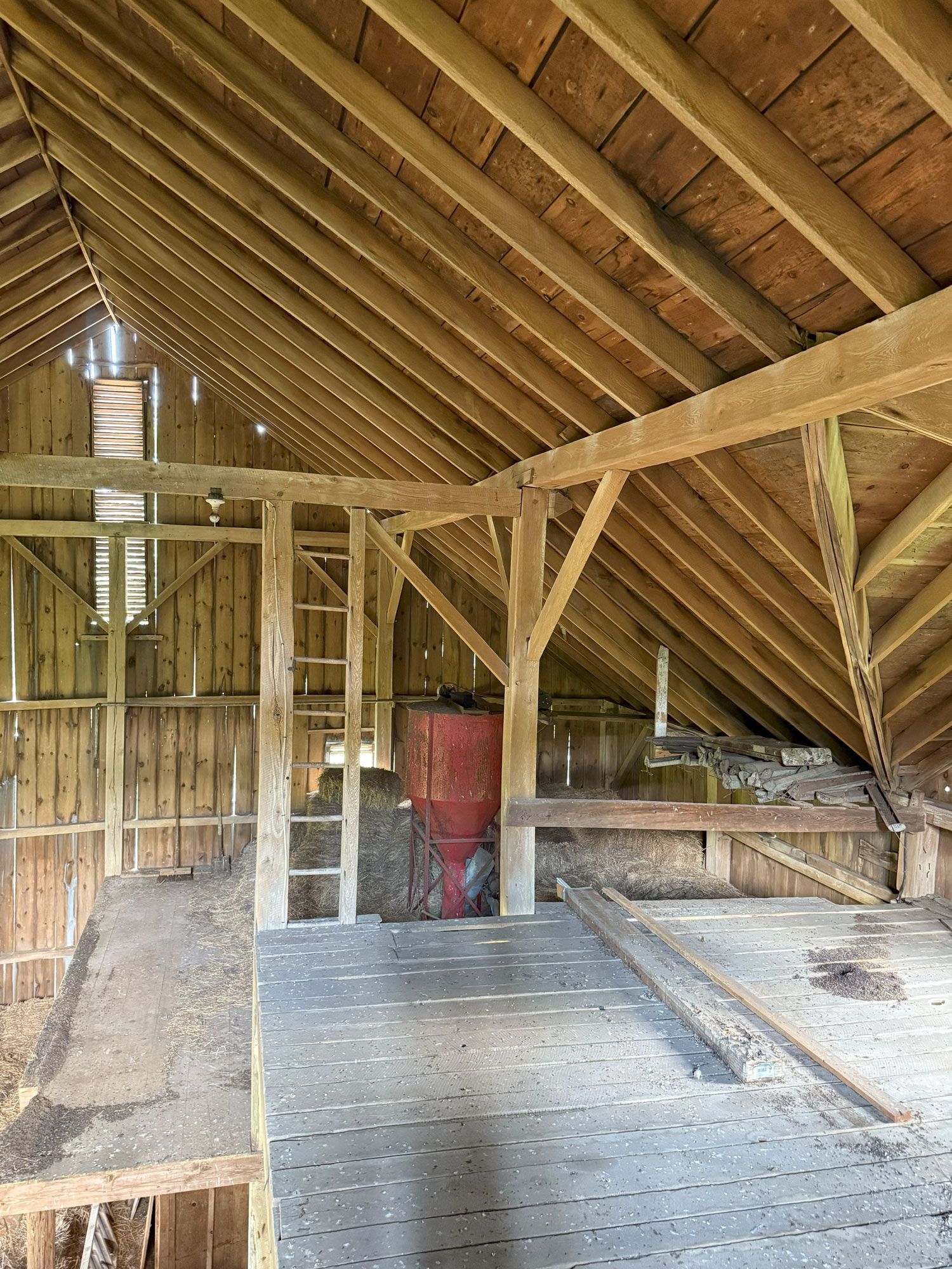 Truly unique in how robust this frame is. The main timbers in the frame measure 11"x 11" and 12"x 12". Once restored, the warm pine timbers will warm a home to its finest. The central space is only interrupted by two big timber ladders and the rest is open for the design of your project. This barn also has an addition that, as an optional space that can be added anywhere around the perimeter of the barn, can serve so many creative purposes. All the more reason to give this barn frame a good look.