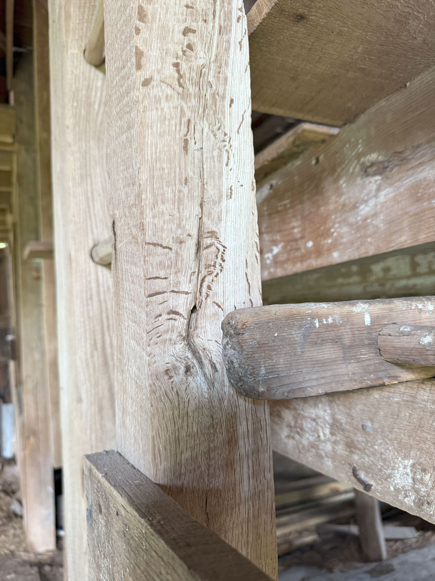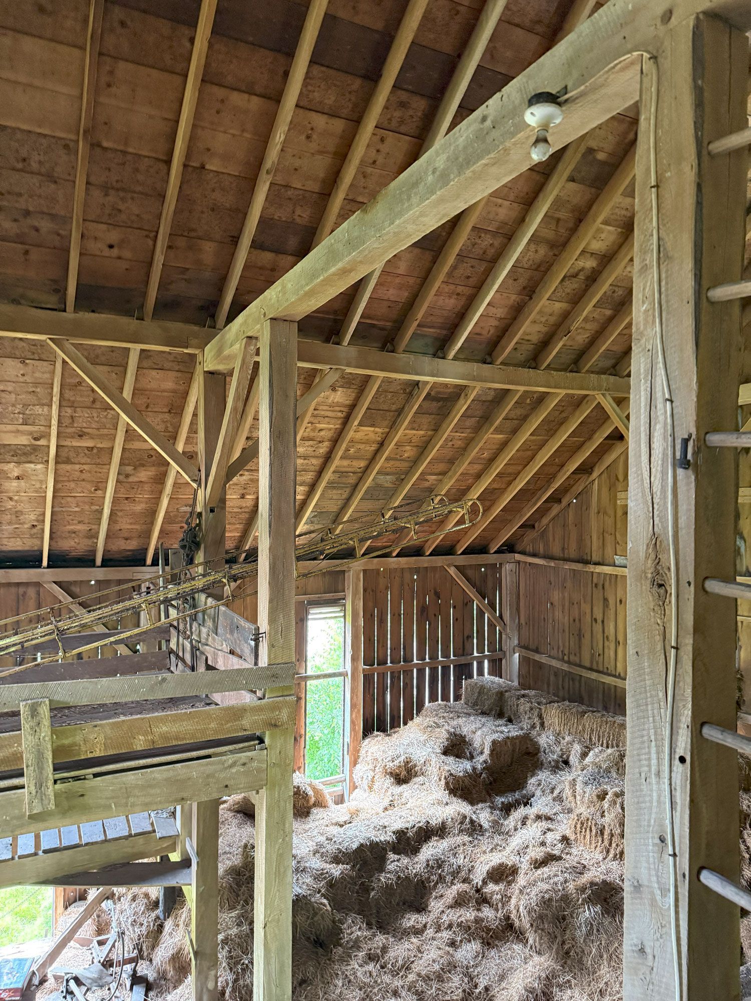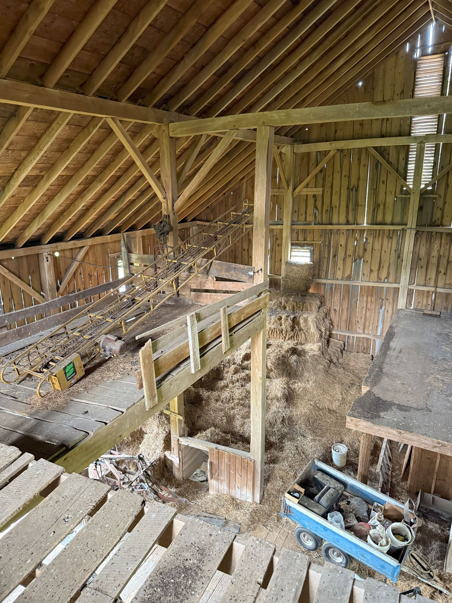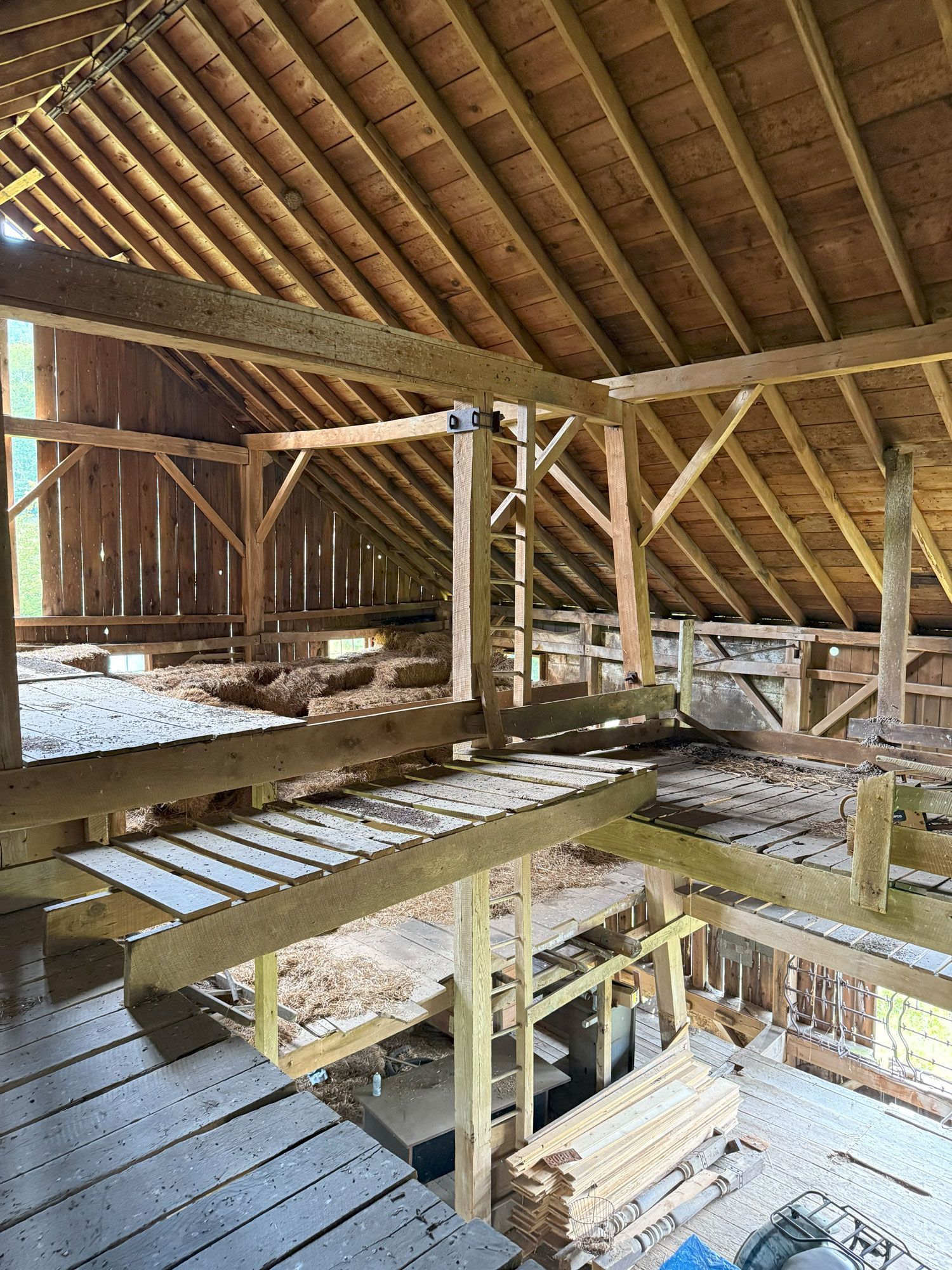 Truly unique in how robust this frame is. The main timbers in the frame measure 11"x 11" and 12"x 12". Once restored, the warm pine timbers will warm a home to its finest. The central space is only interrupted by two big timber ladders and the rest is open for the design of your project. This barn also has an addition that, as an optional space that can be added anywhere around the perimeter of the barn, can serve so many creative purposes. All the more reason to give this barn frame a good look.